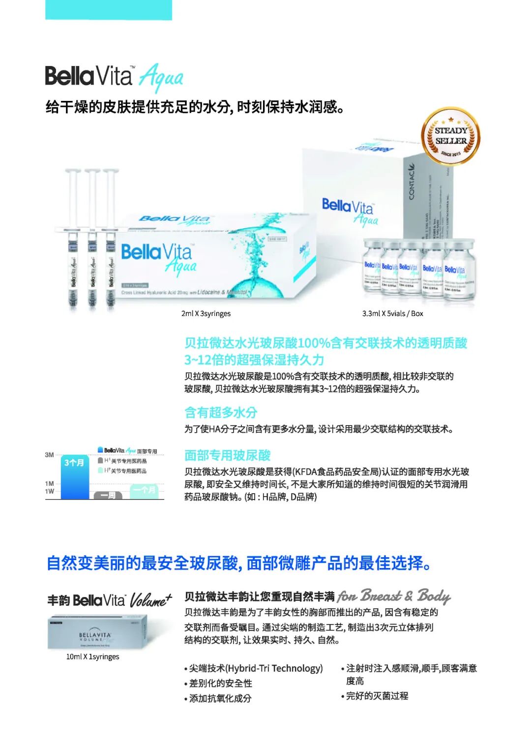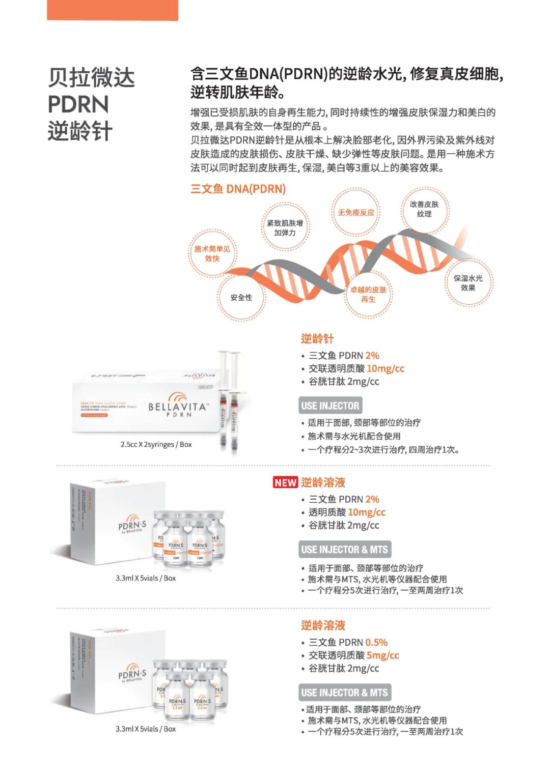 韩国原装进口贝拉微达产品介绍:SKINBOOSTER | INJECTOR | HYDRATION给干燥的皮肤提供充足的水分,时刻保持水润感。贝拉微达水光玻尿酸是百分bai含有交联技术的透明质酸,相比较非交联的玻尿酸,贝拉微达水光玻尿酸拥有其3~12倍的超强保湿持久力。为了使HA分子之间含有更多水分量,设计采用最少交联结构的交联技术。贝拉微达水光玻尿酸是获得KFDA认证的面部专用水光玻尿酸。贝拉微达PDRN逆龄针,含三文鱼DNA(PDRN)的逆龄水光,修复真皮细胞,逆转肌肤年龄。bellavita、bellapro采用0针多用针头:两个瑞士进口马达、安装UV光清洁器后,99.99%的bingdu在几秒钟内死亡,包括guanzhuangbingdu及xijun。
