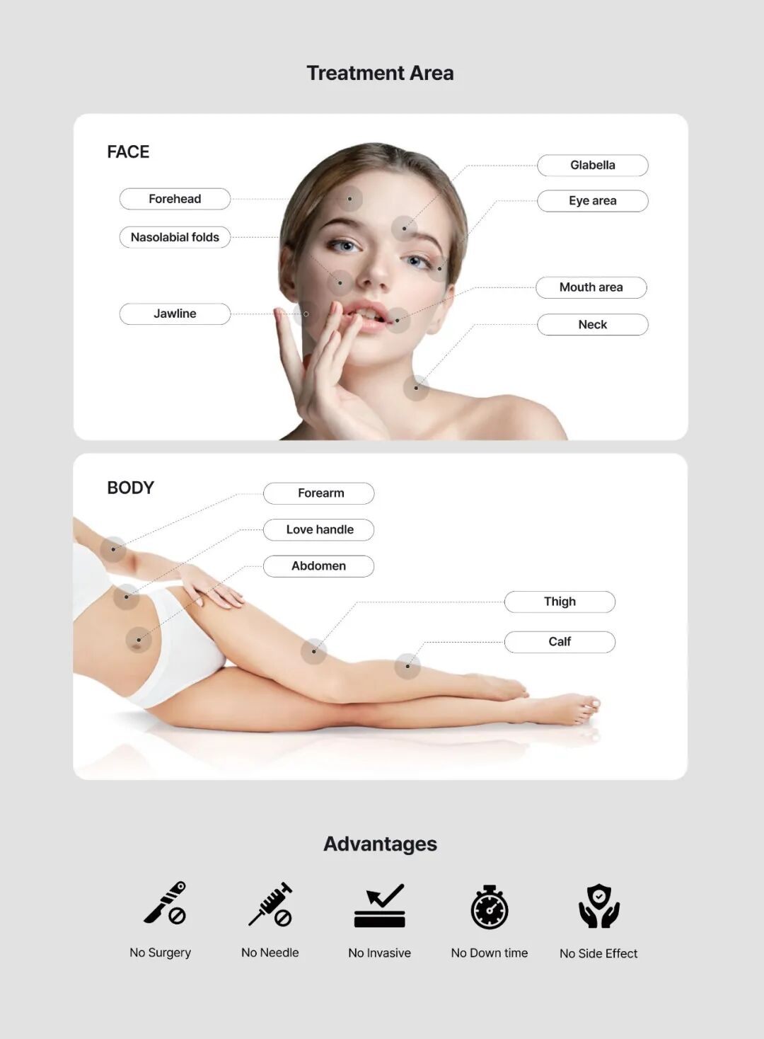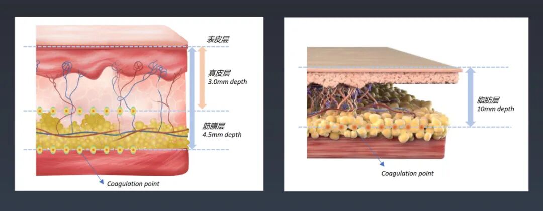 >- 高强度聚焦超声针对真皮层和脂肪层