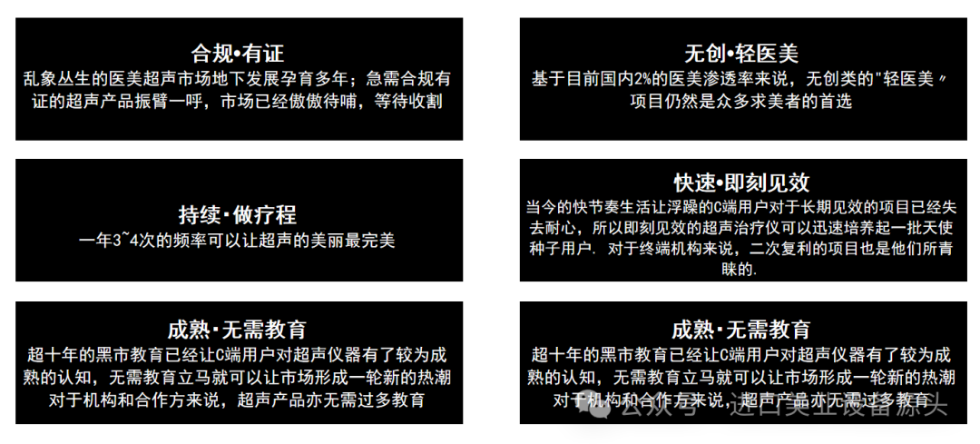 仪器原理:超声治疗仪是一款能快速紧致皮肤,改善皮肤衰老导致的松、垂、皱纹等皮肤问题的抗衰设备。它采用微点聚焦的方式,将超声波能量聚焦在皮下SMAS筋膜层、真皮层、 脂肪组织,并且形成微细热凝固点TCP,起到提拉紧致的作用,达到筋膜悬吊拉皮的效果,再由深至浅改善皮肤皮下结构,令老化的胶原蛋白收缩,并刺激胶原蛋白增生和重组,使皮肤恢复弹性。仪器介绍:1.超声深层抗衰是利用高强度聚焦式超声波,作用于皮下深层,超声的穿透深度和 精准度较高。2.不伤害皮肤表面的同时作用于肌肤真皮层、筋膜层,刺激胶原蛋白的增生与重组,可以起到收紧轮廓,除皱紧肤的作用。3.非侵入式、安全、快速、舒适、有效。4.全层抗衰,smas筋膜层、皮下脂肪、真皮层全覆盖,全面应对肌肤衰老问题。