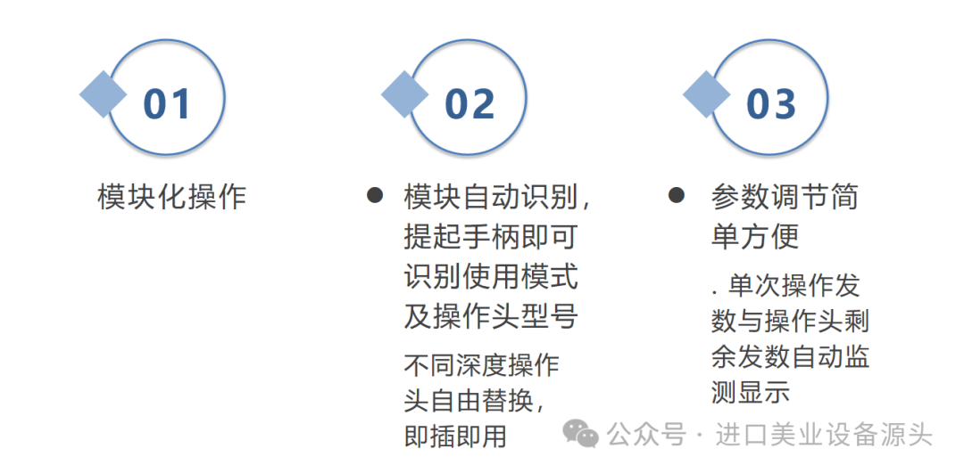 1.M3.0治疗头代表作用深度是3.0mm,也就是我们的真皮深层和皮下脂肪层。2.M4.5治疗头代表作用深度是4.5mm,也就是我们的SMAS筋膜层。3.炮手具有4.5mm、3.0mm、2.0mm三个深度。可以扫描滑动治疗,圆形的设计能覆盖到面部和颈部的治疗细节,滑动累积加热的方式弥补了定点操作时的禁区。4.D2.0治疗头代表作用深度是2.0mm,也就是我们的真皮深层。5.D3.0治疗头代表作用深度是3.0mm,也就是我们的皮下脂肪层。6.D4.5治疗头代表作用深度是4.5mm,也就是我们的SMAS筋膜层。